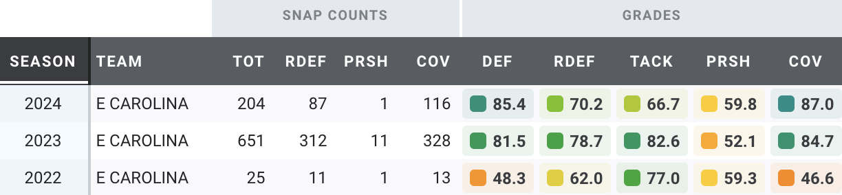Carl Granderson has proven to be a solid long-term edge defender, but Chase Young (53 pressures) may not be back in New Orleans next year, plus has struggled against the run (47.9 PFF run-defense grade). Nic Scourton hasn’t been quite as monstrous in 2024 but has stacked consecutive years with a 75.0-plus PFF run-defense grade.