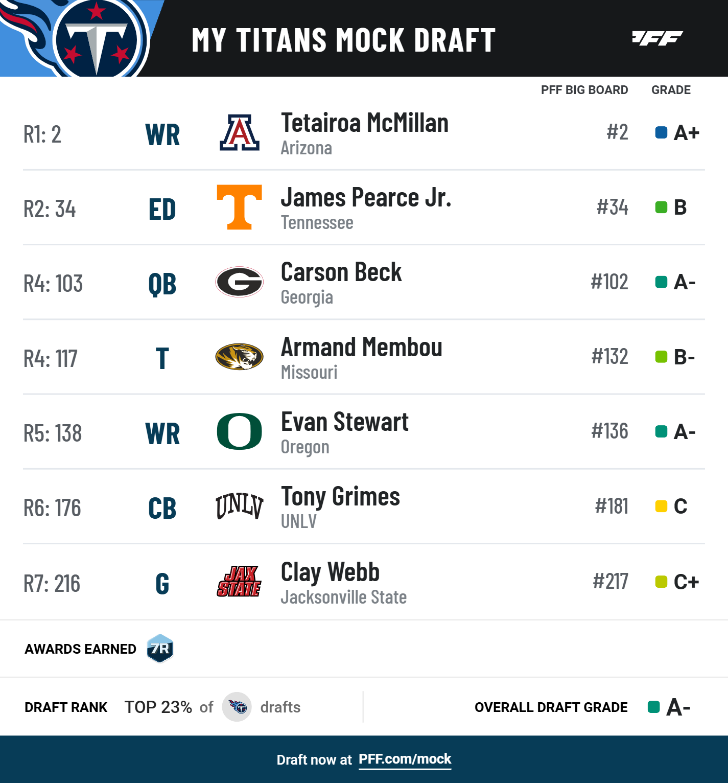 Quarterback Will Levis has displayed more positive signs over the past two weeks, though, with an 8.5% big-time throw rate and just two turnover-worthy plays in that span, so this mock draft is from the perspective of the Titans building around Levis in 2025.