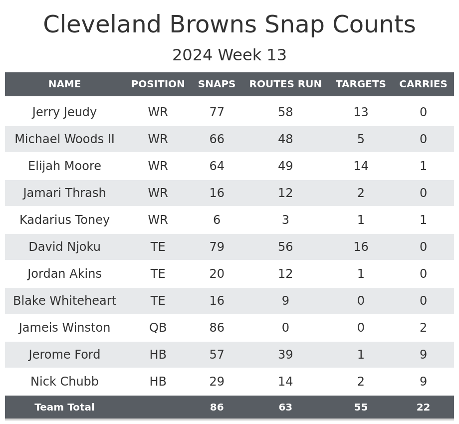 Cleveland also elevated Mike Woods from the practice squad for the first time this season. The 2022 sixth-round pick played 154 snaps in his rookie season, but a ruptured Achilles cost him the 2023 campaign. He surpassed Thrash and Darden to be the X receiver in this game, catching two passes for 29 yards.