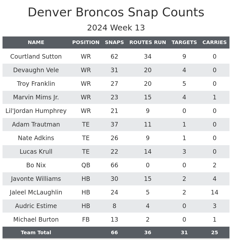 • Snaps include plays called back due to penalties, including offensive holding or defensive pass interference. The other three stats have these plays removed.