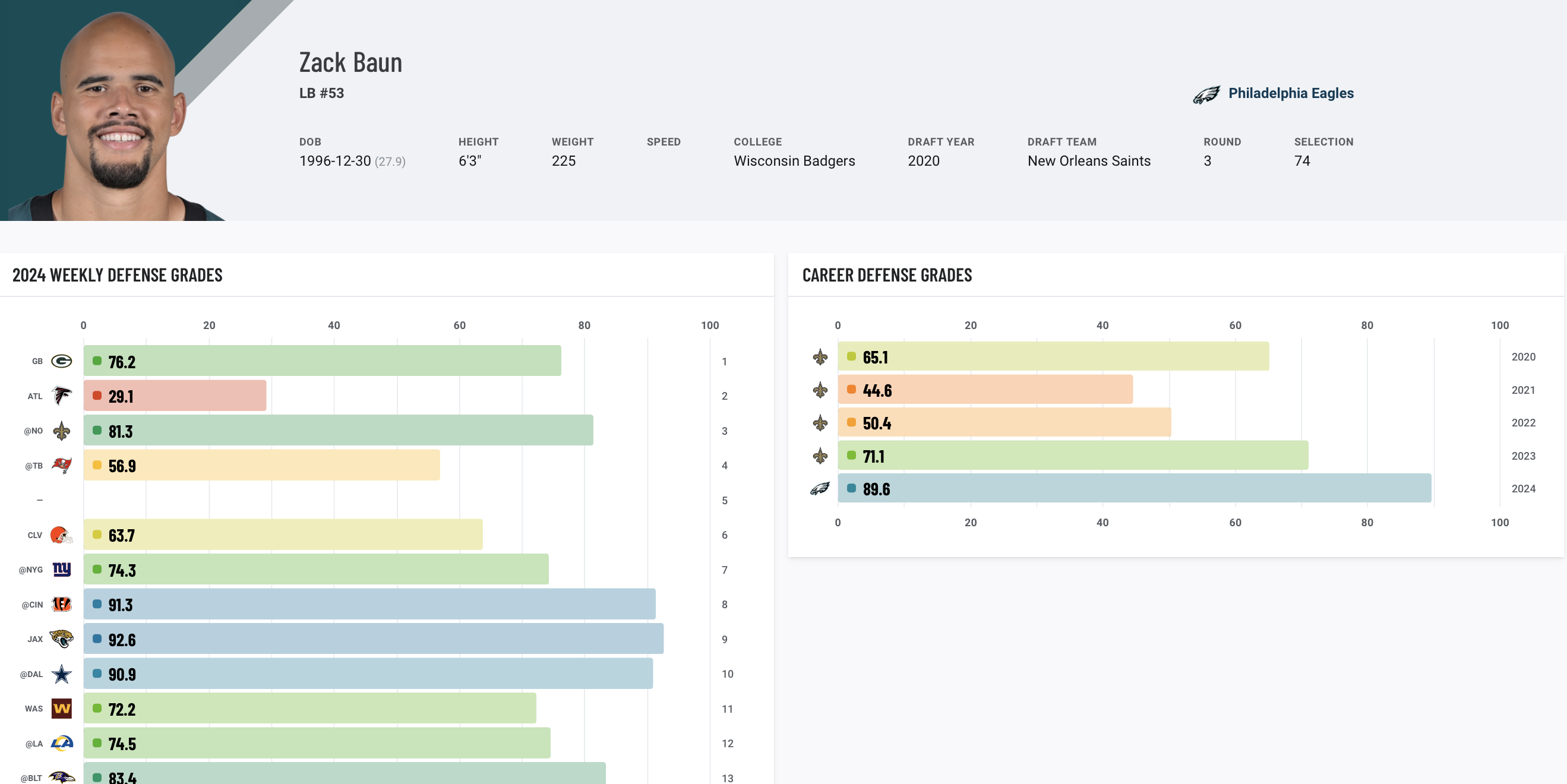 Arguably the biggest breakout player in the NFL this season, Baun consistently delivers strong performances for the Eagles. He leads all linebackers with an 89.6 PFF grade, while his 91.5 PFF coverage grade is also the best at the position.