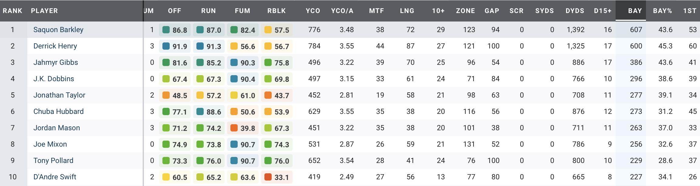 • An uncanny ability to ice games: Barkley leads qualified running backs in fourth-quarter rushing yards, first downs, touchdowns, yards per carry and rushing grade.