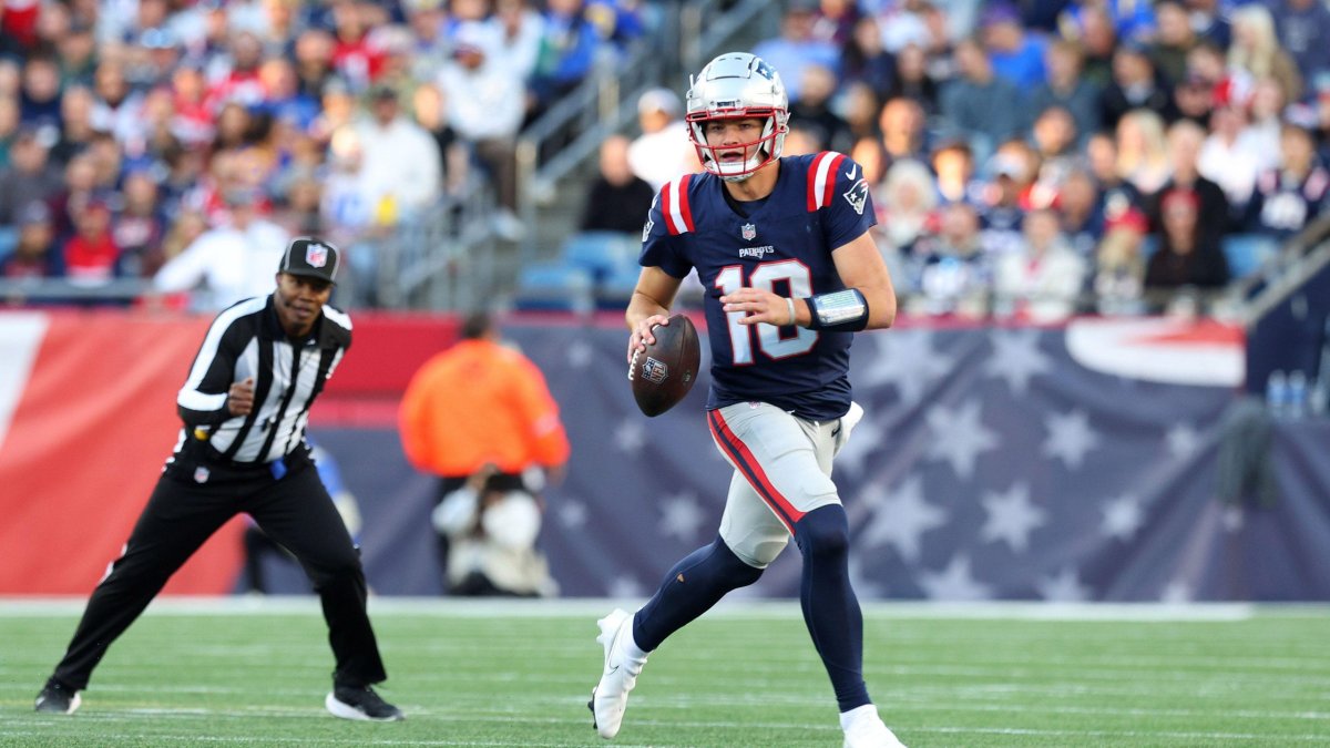 2YK90MB Foxborough, United States. 17th Nov, 2024. November 17, 2024; Foxborough, MA, USA; New England Patriots quarterback Drake Maye (10) runs with the ball during the NFL game between Los Angeles Rams and New England Patriots in Foxborough, MA. Anthony Nesmith/CSM/Sipa USA (Credit Image: © Anthony Nesmith/Cal Sport Media/Sipa USA) Credit: Sipa US/Alamy Live News