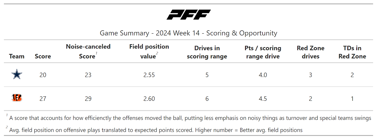 According to PFF's noise-canceled score metric, the Bengals were the better team, even though the game was close in the fourth quarter and they ultimately needed a muffed punt to win the game. The Bengals mostly suffered from an unusually bad performance on third down but were dominant on early downs.