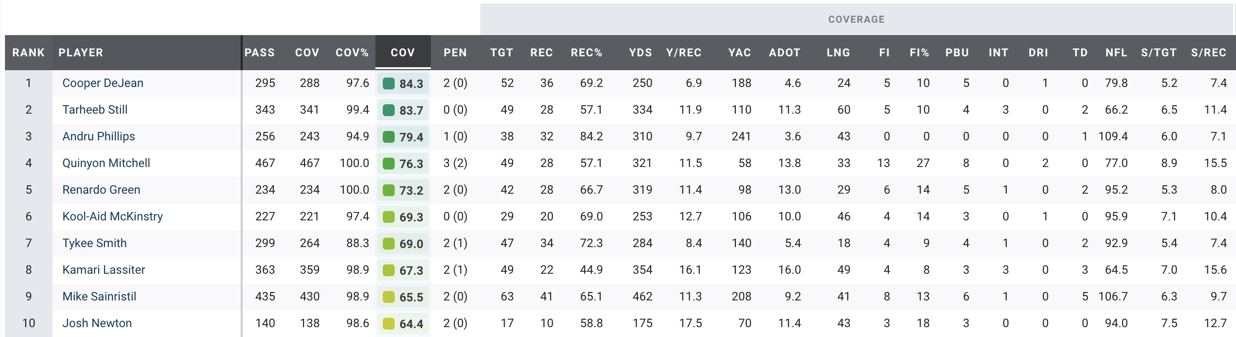 Still vaults up the list this week thanks to a monster game as the Chargers took down the Atlanta Falcons on the road on Sunday. He has earned an 83.7 PFF coverage grade and has recorded three interceptions and four pass breakups.