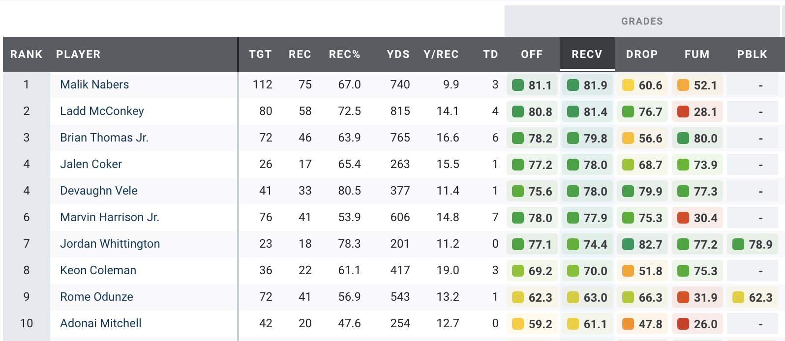 Here are the highest-graded first-year players after 13 weeks of action.